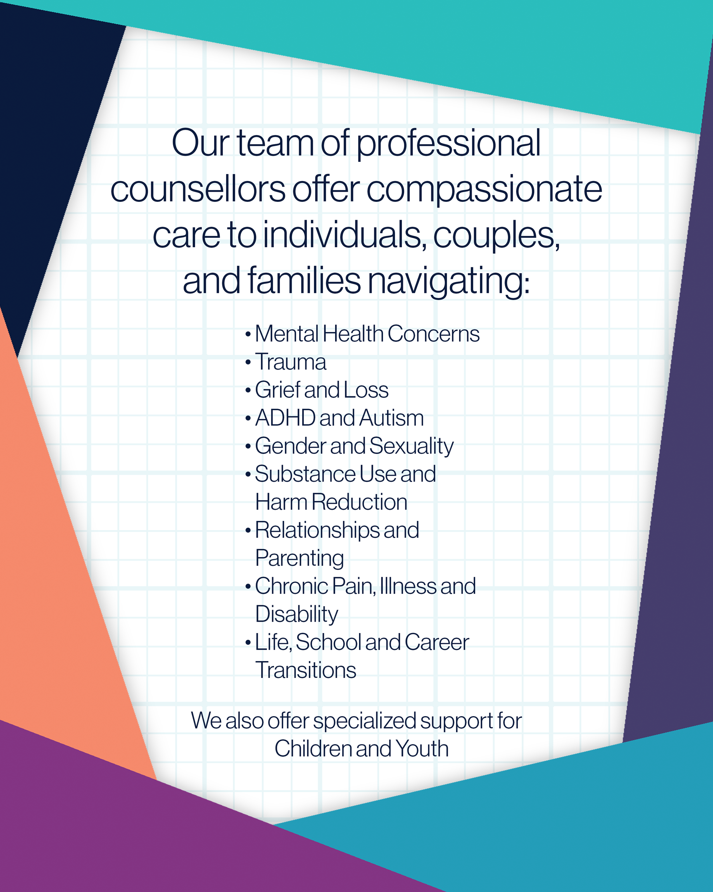 This series of print postcards were produced for distribution at office locations and community events. Using stock photography, brand colours, and bold type, the goal was to promote a variety of therapeutic services appealing to a youthful LGBTQ2IA audience. Note the continuous tiling effect of the colourful decorative motif, which provides a sense of unity and cohesion to the array of printed materials. These images and messages were also reformatted for social media carousel advertisements.