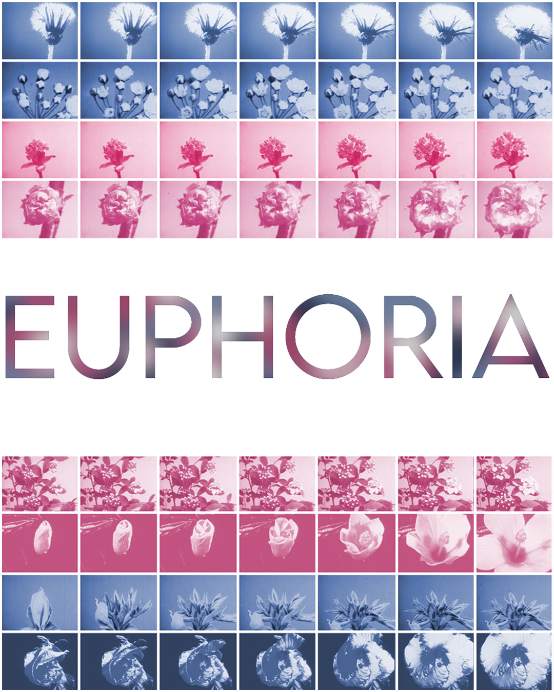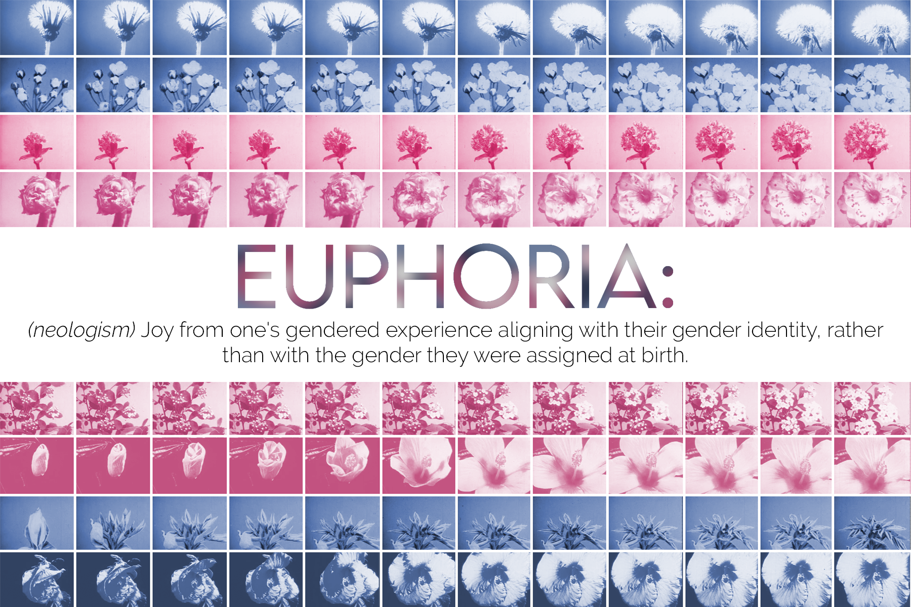 A series of designs for print and social media promoting the Euphoria program; a therapy group focusing on trans youth. The design concept incorporates the iconic pink, blue, and white trans flag composed of thumbnail images of flowers blossoming. This design features a combination of original photography and typographic design, and colourized public-domain film footage. It was assembled in Adobe premiere pro and photoshop.