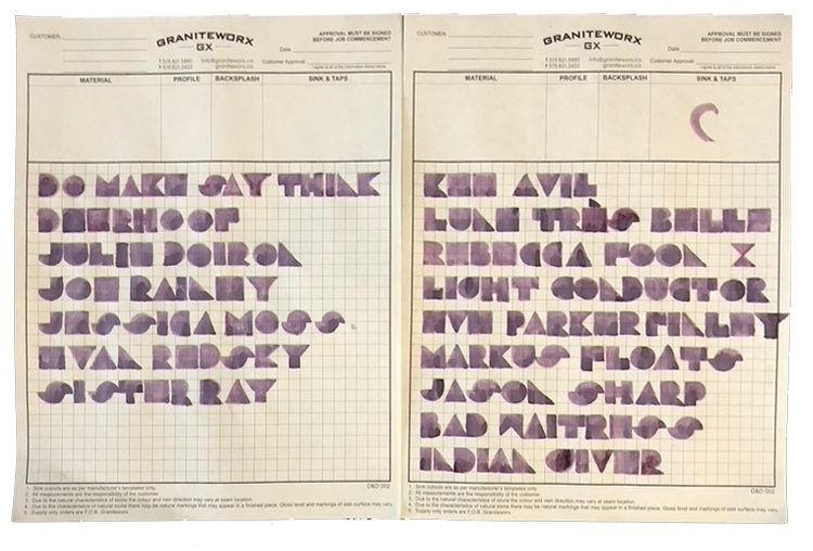 The full festival poster was designed for print at 11”x17” and multiple variants were produced for social media, newsprint ads, and a large-format TTC poster. The custom typography was created by hand with ink made from locally-foraged river grape. The font was named Wharncliffe after the London street where the grapes grew. The geometric border motif was made from electrical schematics line art and letraset type transfer sheets. Lavender & Cyan were chosen for their gentle complimentary hues and icy vibe.